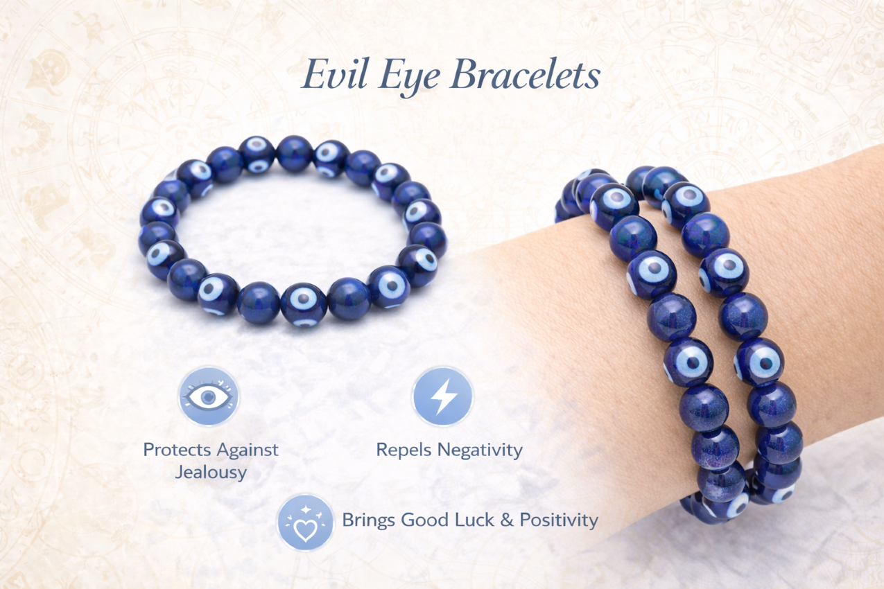 Designed with protective blue tones and sacred symbolism, the Evil Eye bracelet helps guard the wearer from negative energy, bad luck, jealousy, and evil eye dosha. It strengthens the aura, promotes emotional stability, and brings peace of mind—making it ideal for daily wear, travel, work environments, and spiritual protection.