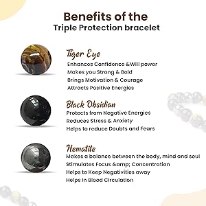 Invite powerful protection, confidence, grounding, and higher awareness into your life with a Natural Triple Protection Bracelet (AAA Quality) from K B VASTU GEMSTONE. Highly respected in Vastu, Astrology, Crystal Healing, and Spiritual practices, the Triple Protection Bracelet is a powerful combination of Tiger Eye, Black Obsidian, and Hematite, known collectively as the Ultimate Protection & Strength Trio.